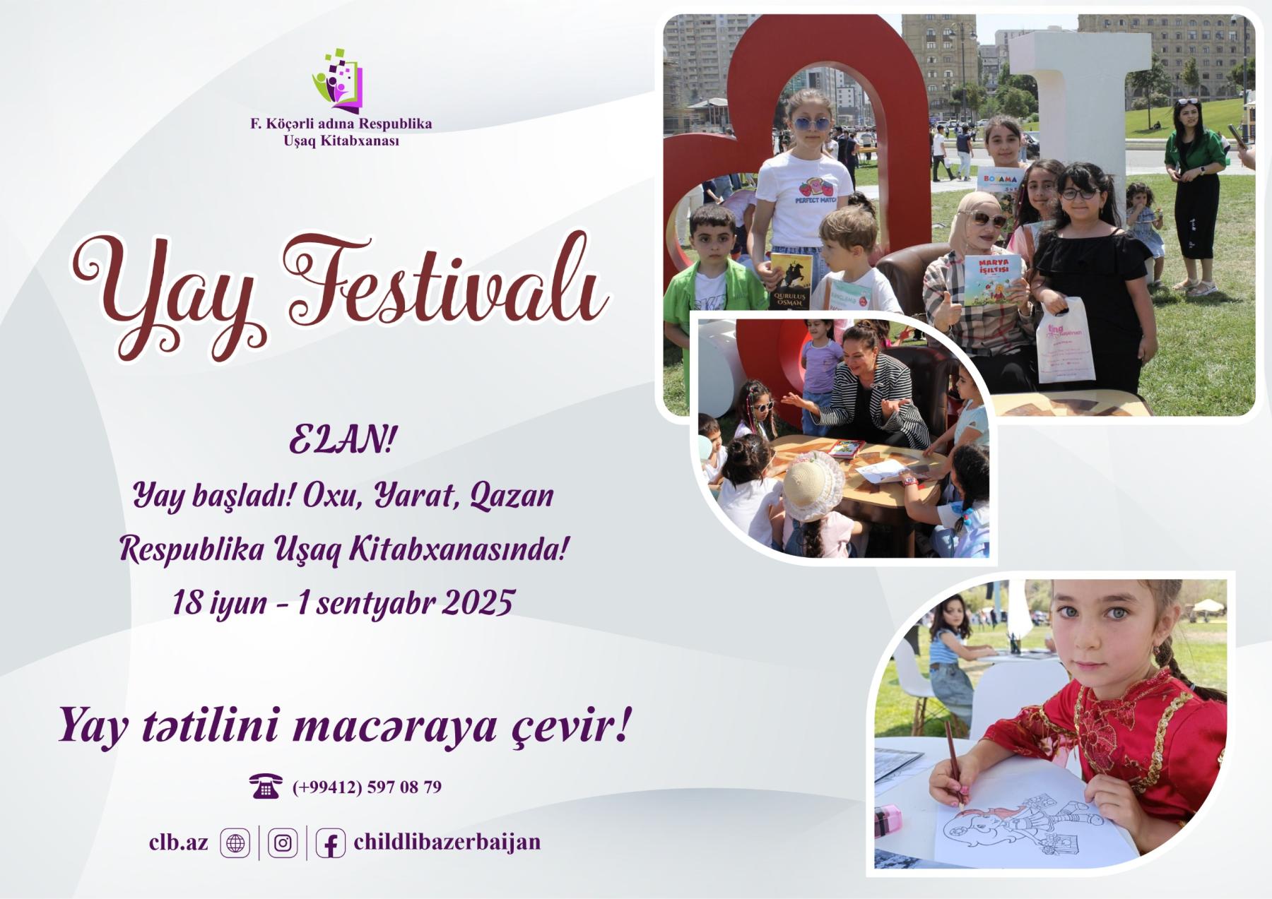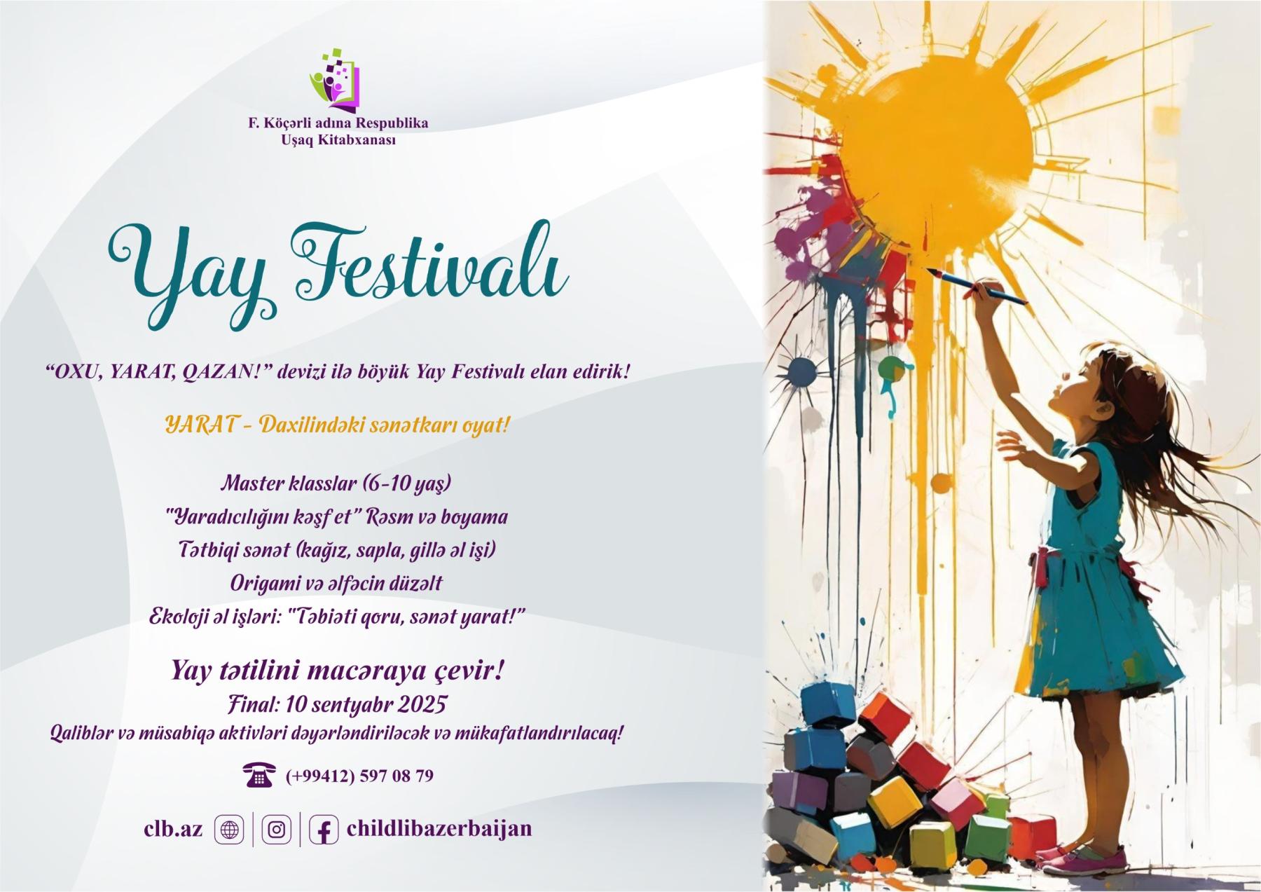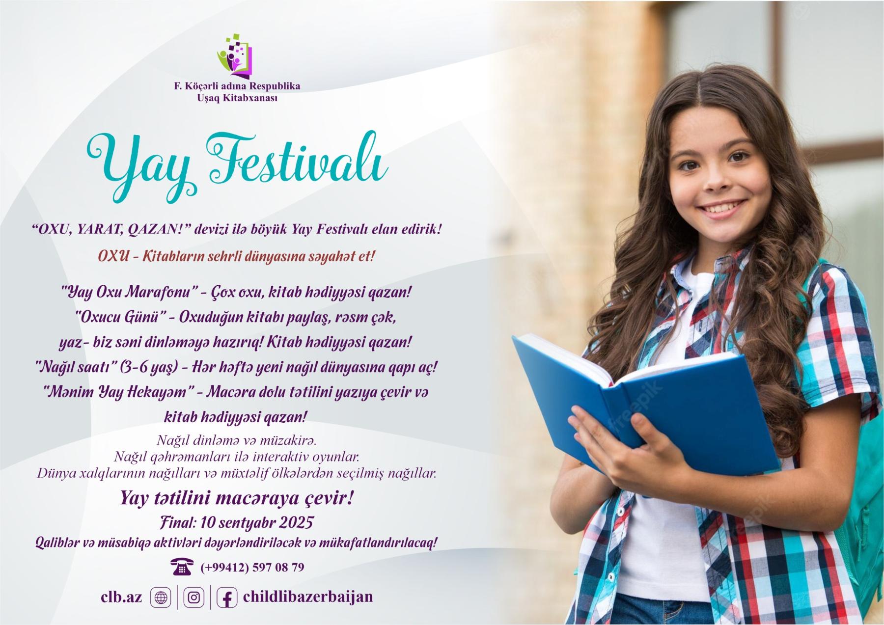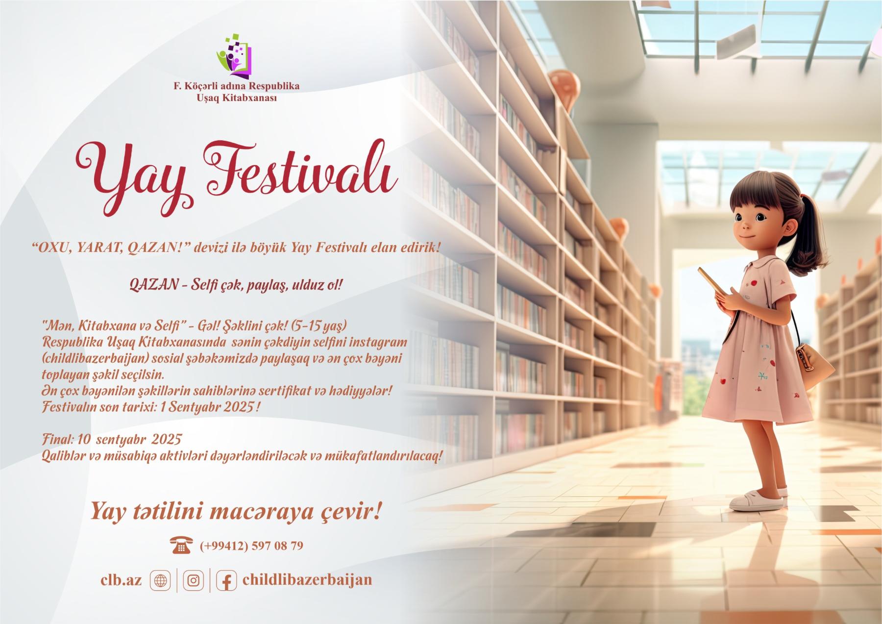F. Köçərli adına Respublika Uşaq Kitabxanası tərəfindən təşkil olunan Yay Festivalı, uşaqların yay tətilini daha dolğun, məzmunlu və yaradıcı şəkildə keçirmələri məqsədilə həyata keçirilir. “OXU, YARAT, QAZAN!” devizi ilə keçiriləcək festival, oxu mədəniyyətinin təbliği, uşaqlarda yaradıcılıq potensialının inkişafı və onların asudə vaxtlarının mənalı şəkildə təşkil olunmasına yönəlmişdir.